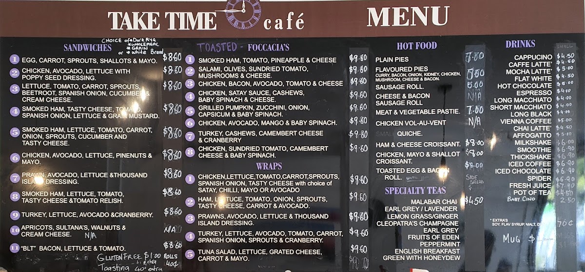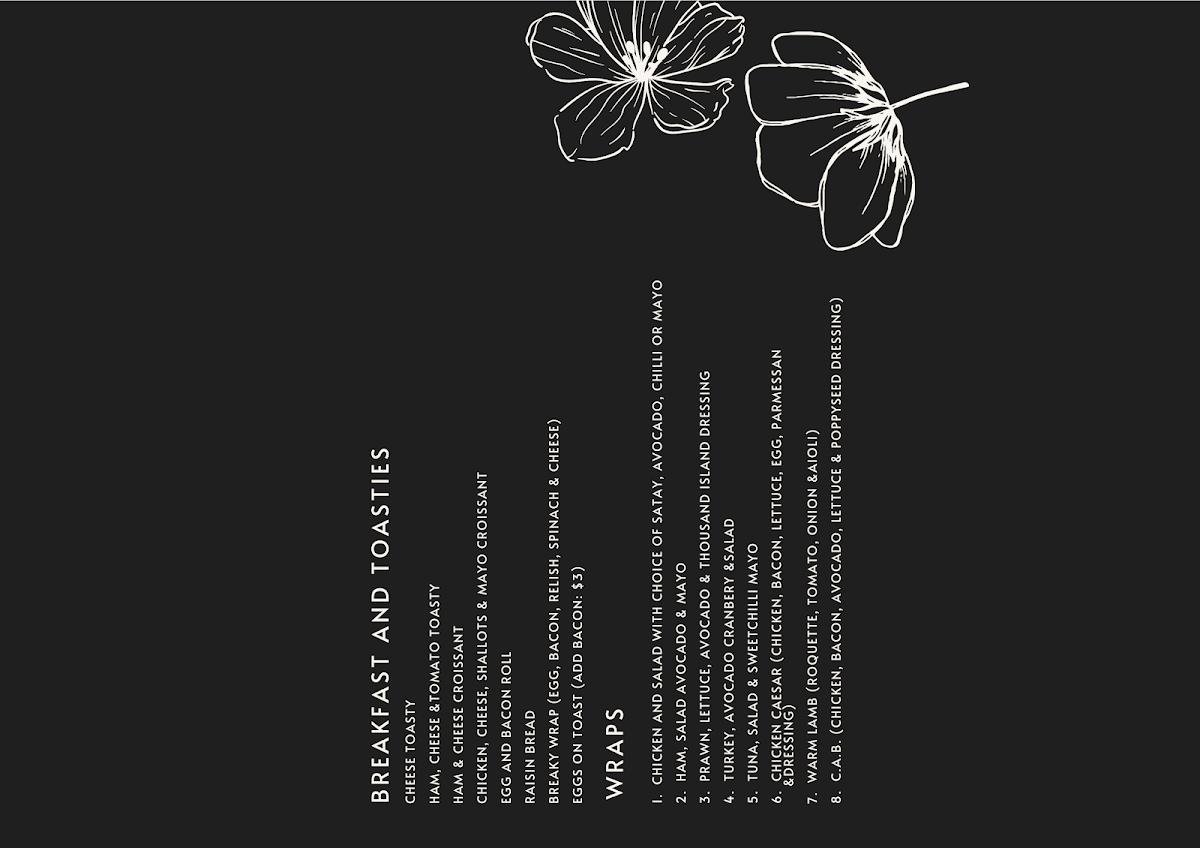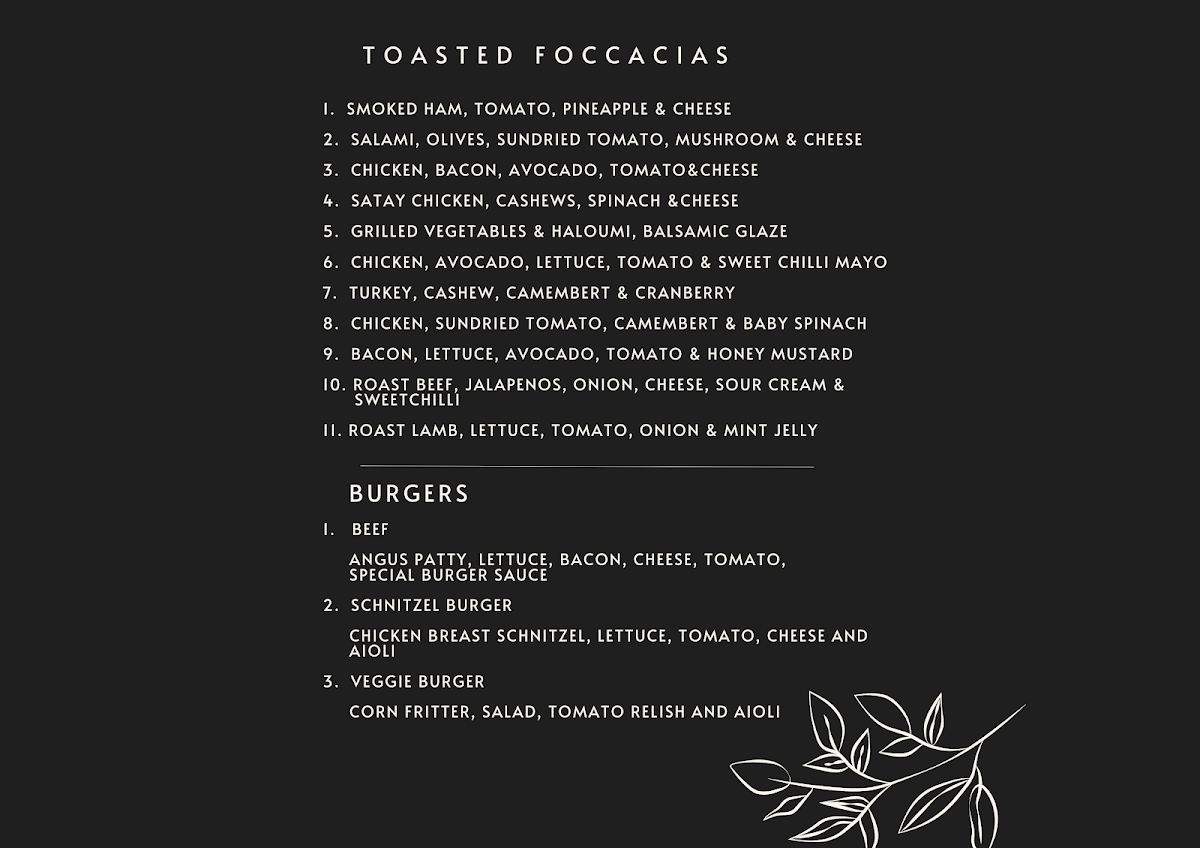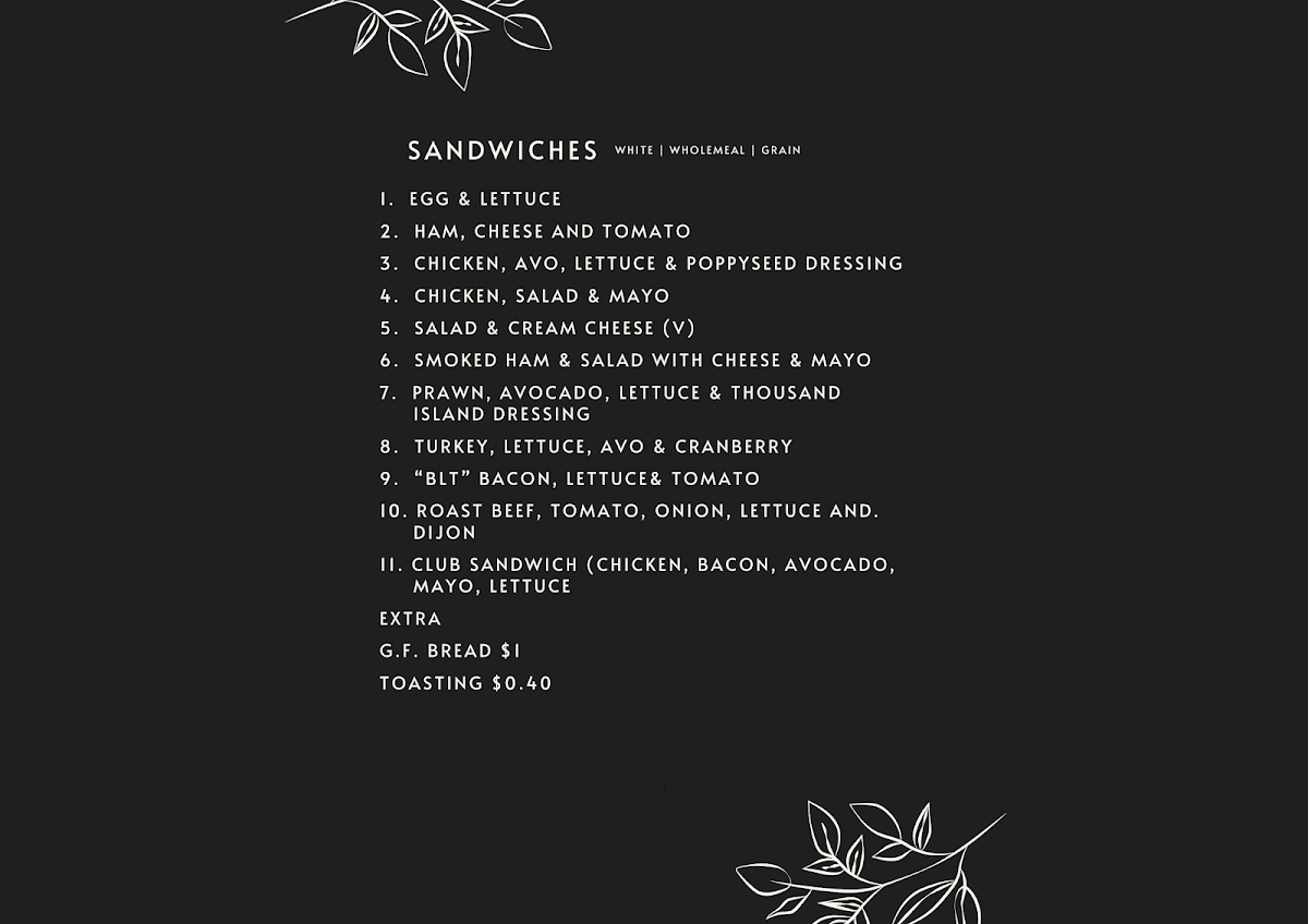 This menu supports casual dining or quick orders, making it practical for customers looking to enjoy breakfast, a light lunch, or a coffee break. The structure allows for straightforward selection across food and beverage categories.